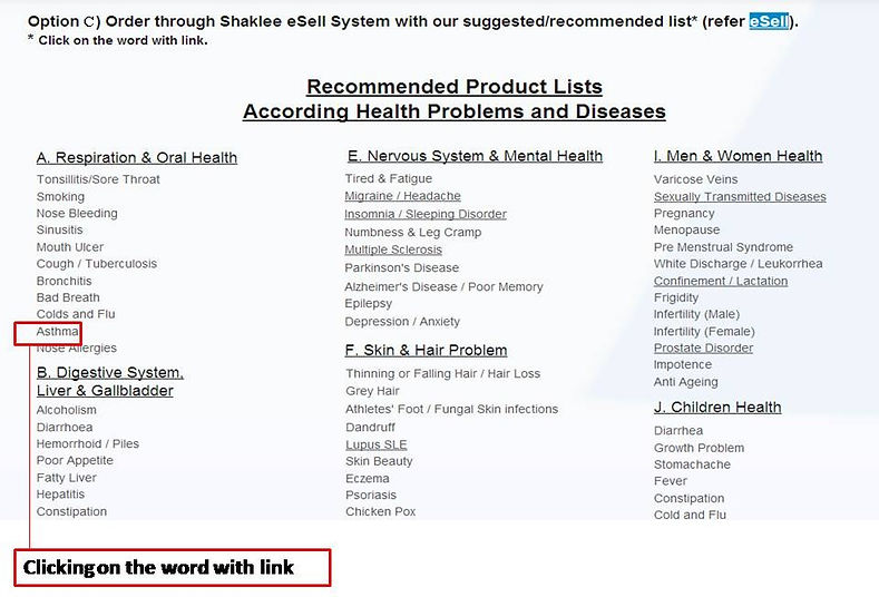 For example, if you are finding products for diabetes patients, you find the word "Diabetes" which is under category "D.Metabolisme/Urinatary" in the Recommended Product Lists According Health Problems and Diseases list . Clicking it will link you to the post about diabetes, there is suggestion of Shaklee products for diabetes patients and also testimonial as a reference. At the end of the post, there will be an eSell logo and the words: Order Here Now. Clicking Order Here Now and you will be brought to Shaklee Ordering Website.